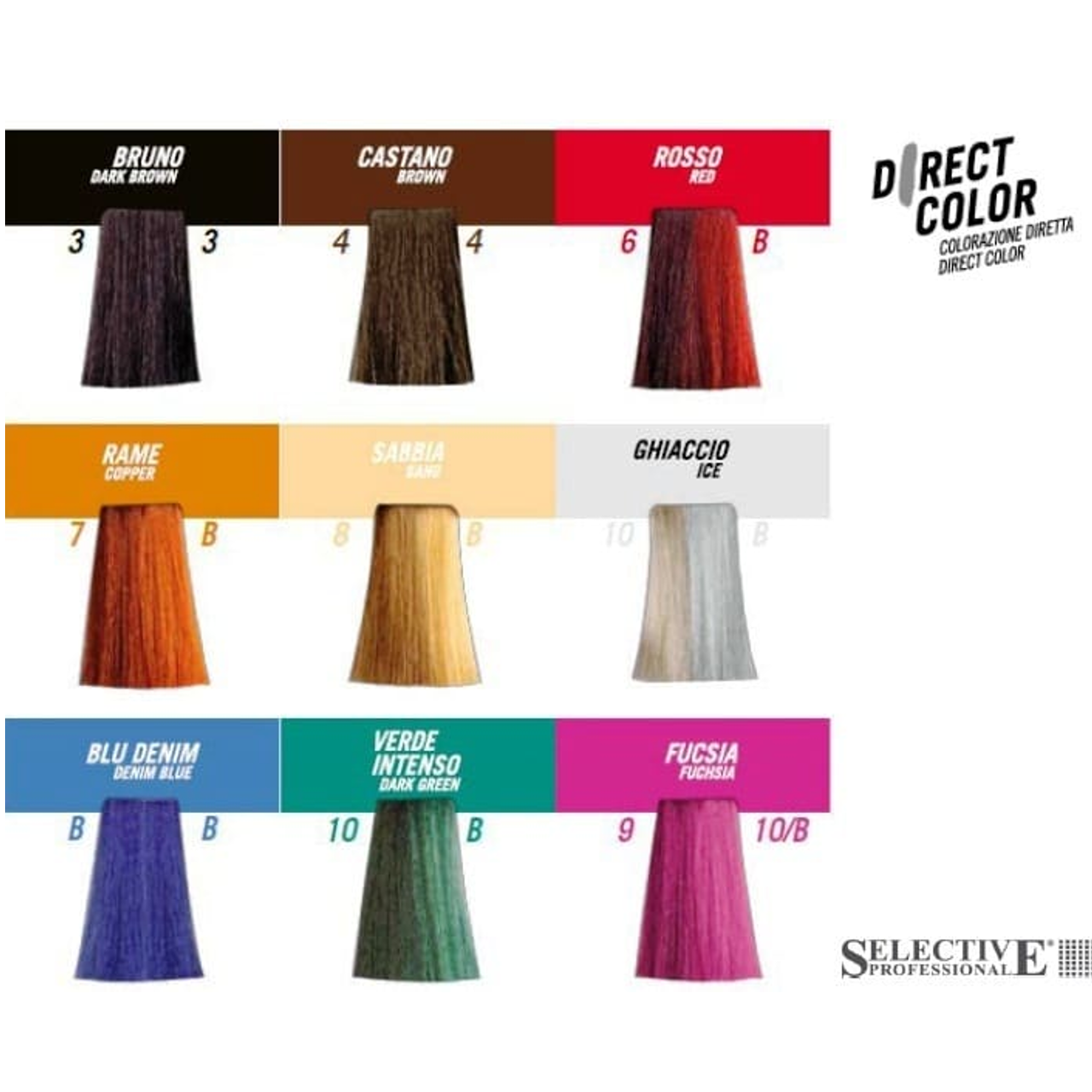 DIRECT COLOR (Selective Professional) - ухаживающая оттеночная краска с кератином. Концентрированные красящие пигменты прямого действия гарантируют насыщенность и точность цвета, придают волосам естественный и живой блеск. Благодаря полному отсутствию аммиака, волосы не обесцвечиваются, а их структура абсолютно не повреждается. +